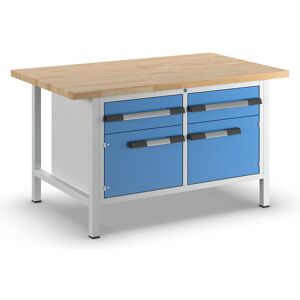 Werkbank, Gestellbauweise Serie 8000, 4 Schubladen, 1 Türfach, BxT 1500 x 700 mm. Anlieferung = montiert. Produkttyp = Werkbänke in Gestellbauweise. Plattenart = Buche-Massivholzplatte. Plattenbreite = 1500 mm. Plattentiefe = 700 mm. Flächentraglast statisch = 1250 kg. Höhe = 840 mm. Gestellfarbe = lichtgrau RAL 7035. Anzahl Schubladen = 4 Stück. Schubladenhöhe = 3x120, 1x180 mm. Schubladentraglast = 100 kg. Plattenstärke = 40 mm. Gestellausführung = Vierkantrohr 45x45 mm. Korpusfarbe = lichtgrau RAL 7035. Frontfarbe = lichtblau RAL 5012. Gestellmaterial = Stahl. Schubladenführung = Rollenführung. Schubladenauszug = 90%. Schubladenbreite = 490 mm. Schubladentiefe = 560 mm. Anzahl Türen = 2 Stück. Türhöhe = 2x580 mm. Anzahl Fachböden = 1 Stück. Langlebig und stabil - ideal für den rauen Industrie-Alltag. Tiefe 700 oder 900 mm - für noch mehr Arbeitsfläche. Verschweißtes Gestell inklusive Tiefenverstrebungen für optimale Stabilität. Montierte Anlieferung - sofort einsatzbereit. Schweißgestell mit Gestellfüßen aus Profil-Stahlrohr (45 x 45 mm) in Lichtgrau RAL 7035. Statische Flächentraglast 1250 kg. Gehäuse pulverbeschichtet lichtgrau RAL 7035, Fronten lichtblau RAL 5012. Schubladen auf leichtgängigen Rollenführungen 90% ausziehbar. Tragkraft 100 kg. Innen-Breite x -Tiefe 490 x 560 mm. Aluminium-Griffleisten mit Farb- und Beschriftungsstreifen. Massive Buche-Arbeitsplatte - langlebig und robust. Holz aus nachhaltiger, PEFC-zertifizierter Forstwirtschaft. Oberflächenschutz durch Lackleinöl. 1 Doppel-Unterbau-Container, Breite x Tiefe x Höhe 1405 x 650 x 620 mm, mit folgender Einteilung: Links: 4 x Schubladen-Größe L 3 x 120 mm, 1 x 180 mm. Rechts: 1 x Doppel-Flügeltür Höhe 580 mm (dahinter 1 Fachboden, höhenverstellbar). Schubladen-Größe L (Innenbreite x -tiefe 490 x 560 mm, Tragkraft 100 kg). Die Nutzhöhe der Schublade entspricht der Fronthöhe abzgl. 15 mm. Rollengelagerte Teilauszugsschienen (Auszug 90 %) mit Selbsteinlauf und Rücklaufsicherung. Flügeltüren mit selbstzuziehenden Federscharnieren, Öffnungsweite 180°. Zentralverschluss (Stiftzylinderschloss mit 2 Schlüsseln). Mehr Platz, Ordnung und Übersicht durch großes Zubehörsortiment unter Zubehör. Ohne Aufpreis lieferbar: 14 Farben bzw. über 200 Farbkombinationen! RAL 3000 Feuerrot RAL 5002 Ultramarinblau RAL 5010 Enzianblau RAL 5011 Stahlblau RAL 5012 Lichtblau RAL 5015 Himmelblau RAL 5018 Türkisblau RAL 6011 Resedagrün RAL 7016 Anthrazitgrau RAL 7031 Blaugrau RAL 7035 Lichtgrau RAL 7045 Telegrau RAL 9006 Weißaluminium RAL 9011 Graphitschwarz