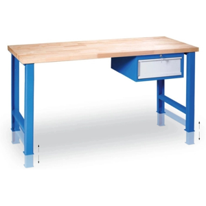 Die Container werden direkt am unteren Teil der Arbeitsplatte angeschraubt. Die Schrank und der Container mit einer Höhe von 810 mm bilden im Falle ihrer Verwendung direkt ein festes Tischbein. Die Arbeitstischplatte ist aus einer massiven Fugenplatte aus Hartholz mit einer Stärke von 40 mm hergestellt. Das höhere Plattengewicht gewährleistet gemeinsam mit den festen und stabilen Fußgestellen eine sehr gute Stabilität des Tischs, die auch den anspruchsvollsten Tätigkeiten genügt. Die Fußgestelle können aus zwei Typen ausgewählt werden, klassisch fest oder höhenverstellbar. Bei der Verwendung von festen Fußgestellen beträgt die Gesamttischhöhe 850 mm, bei der Verwendung von höhenverstellbaren Fußgestellen kann die Höhe dann bis zu 1050 mm in Schritten von 50 mm verstellt werden. Eigenschaften: Höhe (mm): 850 - 1050, Tiefe (mm): 800, Konstruktionsfarbe: blau RAL 5015, Farbe: blau, Länge (mm): 1700, Regalboden: -, Gestelltyp: höhenverstellbare Unterlage, Ausstattung: 1x 1 Schubladencontainer, Tragfähigkeit der Arbeitsplatte (kg): 500, Material der Arbeitsplatte: Buche-Leimholzplatte, Anzahl Schubladen: 1, Anzahl Schränke: 0, Schubladen-/Türfarbe: grau RAL 7035, Antriebstyp: mechanisch, Möbelkollektion: GD