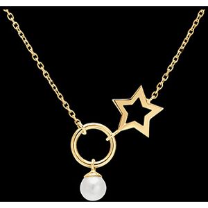 Eine Halskette aus Gelbgold, geschmückt mit einem Ring, einer Perle und einem Stern-Anhänger, für ein Modell voller Bewegung und Leichtigkeit.Mit Kette 42 cm + Verlängerung von 3 cm; 750/-. Gelbgold (750/-): 1.6 g.Weisse Perle : 1 -