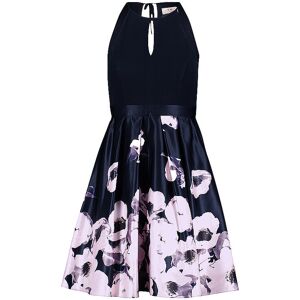 Damen Cocktailkleid aus Jersey und Satin Rundhalsausschnitt mit Cut-Out Ärmellos Ausgestelltes Rockteil mit floralem Print Farbbezeichnung: Dark Blue - Ros Gesamtlänge: 96 cm Länge ab Taille: 54 cm Material:  100% Polyester Besatz: 100% Polyester Oberteil: 95% Polyester, 5% Elasthan Unterrock: 100% Polyamid