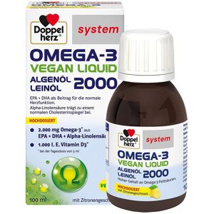 Anwendungsgebiet von Doppelherz Omega-3 Vegan Liquid 2000 SystemDas hochdosierte Doppelherz Omega-3 Vegan Liquid 2000 System liefert pro 5ml Tagesdosis 2.000 mg Omega-3-Fettsäuren auf nicht-tierischer Basis aus hochwertigem Algenöl und Leinsamenöl, bestehend aus 992 mg DHA/8 mg EPA und 1.000 mg ALA (alpha-Linolensäure) plus 25 μg Vitamin D pflanzlicher Herkunft. Die Omega-3-Fettsäuren EPA/DHA in Doppelherz system OMEGA-3 VEGAN LIQUID werden aus dem Öl einer speziellen Mikroalge (Schizochytrium sp.) gewonnen. Die alpha-Linolensäure (ALA) stammt aus einem hochwertigen Leinsamenöl. Die Omega-3-Fettsäuren EPA/DHA tragen bei einer täglichen Aufnahme von 250 mg zur normalen Herzfunktion bei. DHA leistet bei einer Aufnahme von 250 mg täglich zudem auch einen Beitrag zum Erhalt einer normalen Gehirnfunktion sowie zum Erhalt der normalen Sehkraft. Alpha-Linolensäure (ALA) trägt zu einem normalen Cholesterinspiegel bei. Die positive Wirkung stellt sich bei einer Tagesaufnahme von 2 g ALA ein. Vitamin D, das Multitalent für die Gesundheit, trägt zum Erhalt normaler Knochen, der normalen Muskelfunktion sowie zu einer normalen Funktion des Immunsystems bei.Wirkstoffe / Inhaltsstoffe / ZutatenZutaten von Doppelherz Omega-3 Vegan Liquid 2000 System:Leinsamenöl, Öl aus der Mikroalge Schizochytrium sp., Sonnenblumenöl, Olivenöl, Antioxidationsmittel stark tocopherolhaltige Extrakte, Aroma, Vitamin DGegenanzeigenBei bekannter Überempfindlichkeit gegenüber einen der oben genannten Inhaltsstoffe sollte dieses Produkt nicht angewendet werden.DosierungVerzehrempfehlung von Doppelherz Omega-3 Vegan Liquid 2000 System:Erwachsene verzehren täglich 5 ml (entspricht ca. 1 Teelöffel). Kinder ab 6 Jahren verzehren täglich 2,5 ml. Kann pur, in Fruchtsäften oder Milchprodukten, z.B. Joghurt, eingenommen werden.SchwangerschaftFür Schwangere und Stillende nicht geeignet.HinweiseNahrungsergänzungsmittel stellen keinen Ersatz für eine abwechslungsreiche Ernährung dar. Ei