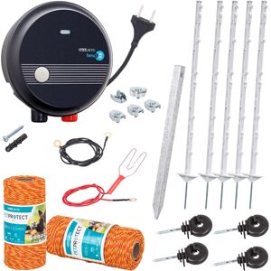 Der optimale Elektrozaun zum Schutz Ihres Gartens und zur Einzäunung von Hunden, Katzen und anderen Kleintieren. Mit dem Set können Sie je nach Aufbauart bis zu 100m Zaun spannen. Details * Gerät mit reduzierter Stromabgabe * für kürzere, bewuchsfreie Zäune entwickelt * Kontroll-LED zur Überwachung der Zaunspannung * witterungsbeständiges und robustes Gehäuse * einfachste Handhabung * hergestellt in Deutschland Technische Daten Stromquelle: 230V Spannung: ca. 9200 Volt (Leerlauf) Ladeenergie: 0,06 Joule Entladeenergie: 0,04 Joule Sromverbrauch: 0,15 Watt B x H x T: 94 x 60 x 60mm Lieferumfang Das Set ist sehr umfangreich, für die unterschiedlichsten Einzäunungen ausgelegt: 1x Netzgerät NV100 2x 100m Kunststofflitze, 3x0,20 Niro, orange 10x Kunststoffpfahl, 104cm (86cm über Grund), weiss 1x Erdungspfahl, verzinkt, 1,00m 25x Ringisolatoren, mit Holzgewinde, schwarz 1x Zaunanschlußkabel, Erdanschlußkabel 1x Warnschild 1x Bedienungsanleitung und Aufbauanleitung